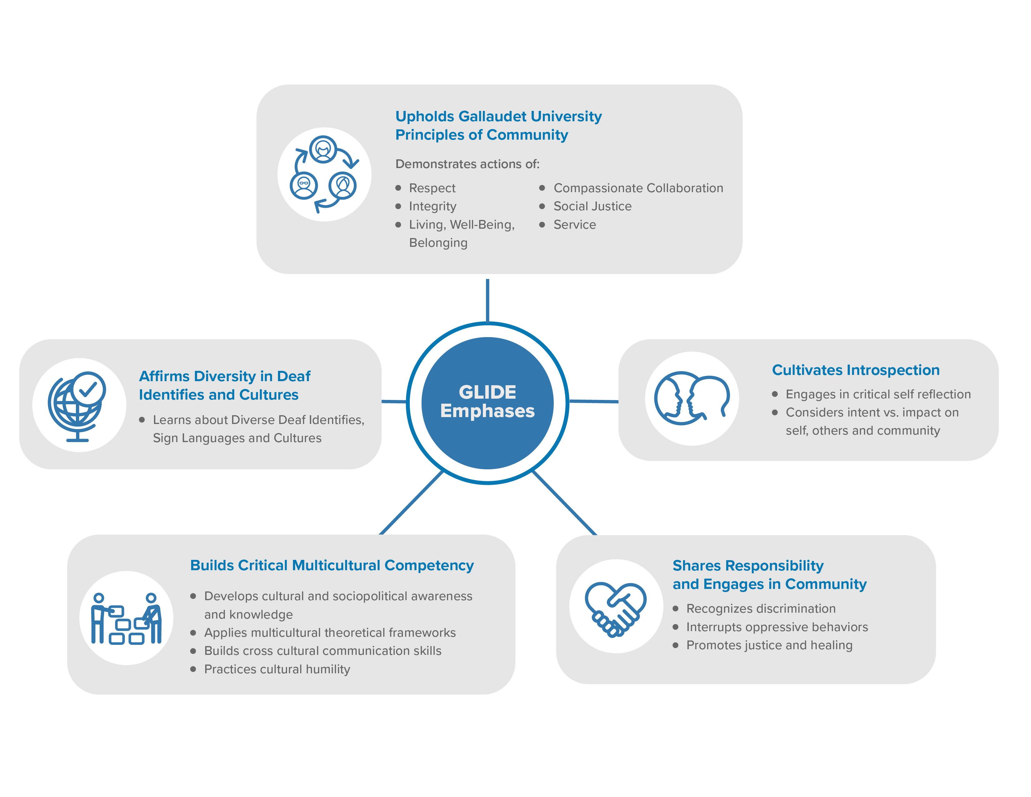 The Graduate-Level Inclusion and Diversity Education (GLIDE) Program capitalizes on the rich diversity in culture, language, worldview, race/ethnicity, values, and beliefs that make up the Gallaudet Community. This program is intended to ensure that graduate students are exposed to and engaged with learning experiences related to equity, diversity, and inclusion that align with Gallaudet University’s unique Deaf cultural and bilingual educational mission within a multicultural setting. The GLIDE program empowers our graduates to fully embrace and appreciate human diversity, acknowledge and effectively work with the complexities of intersectionality, and moreover become culturally competent and responsive leaders.